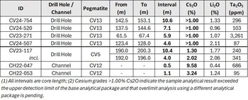 - A review of the Company's drill core assay dataset has identified multiple distinct areas of considerable cesium enrichment (>1% Cs2O)