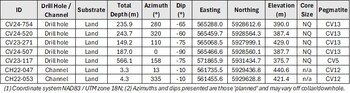 - At CV9, geological modelling is ongoing on a hole-by-hole basis and as assays are received. However, current interpretation indicates CV9 is comprised of a single principal dyke, which outcrops at surface, has a steep northerly dip, and is moderately plunging to the east-southeast. A strike length of 450 m has been delineated through drilling and outcrop.