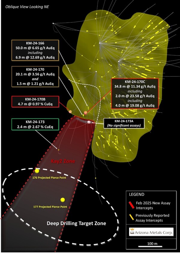 TORONTO, March 3, 2025 /CNW/ - Arizona Metals Corp. (TSX: AMC) (OTCQX: AZMCF) (the "Company" or "Arizona Metals") is pleased to announce assay results from three drill holes in the Kay2 Zone and one hole from the West target at the Kay project in Arizona. In the Kay2 Zone, drill hole KM-24-170C intersected 34.8 m @ 11.3 g/t AuEq, including 2.0 m @ 23.6 g/t AuEq and 4.0 m @ 19.1 g/t AuEq. (Figure 1, Table 1). One sample in this drill hole returned 33.5 g/t Au, the third highest gold assay on the project to date (691.1-691.7 m). The hole is located approximately 40 below hole KM-24-166, the discovery hole in the Kay2 Zone. A second drill hole in the Kay 2 Zone, KM-24-170B, intersected 4.7 m @ 1.0% CuEq (Figure 1, Table 1). The Kay2 Zone is located approximately 100 m north of previously drilled mineralization in the Kay deposit.