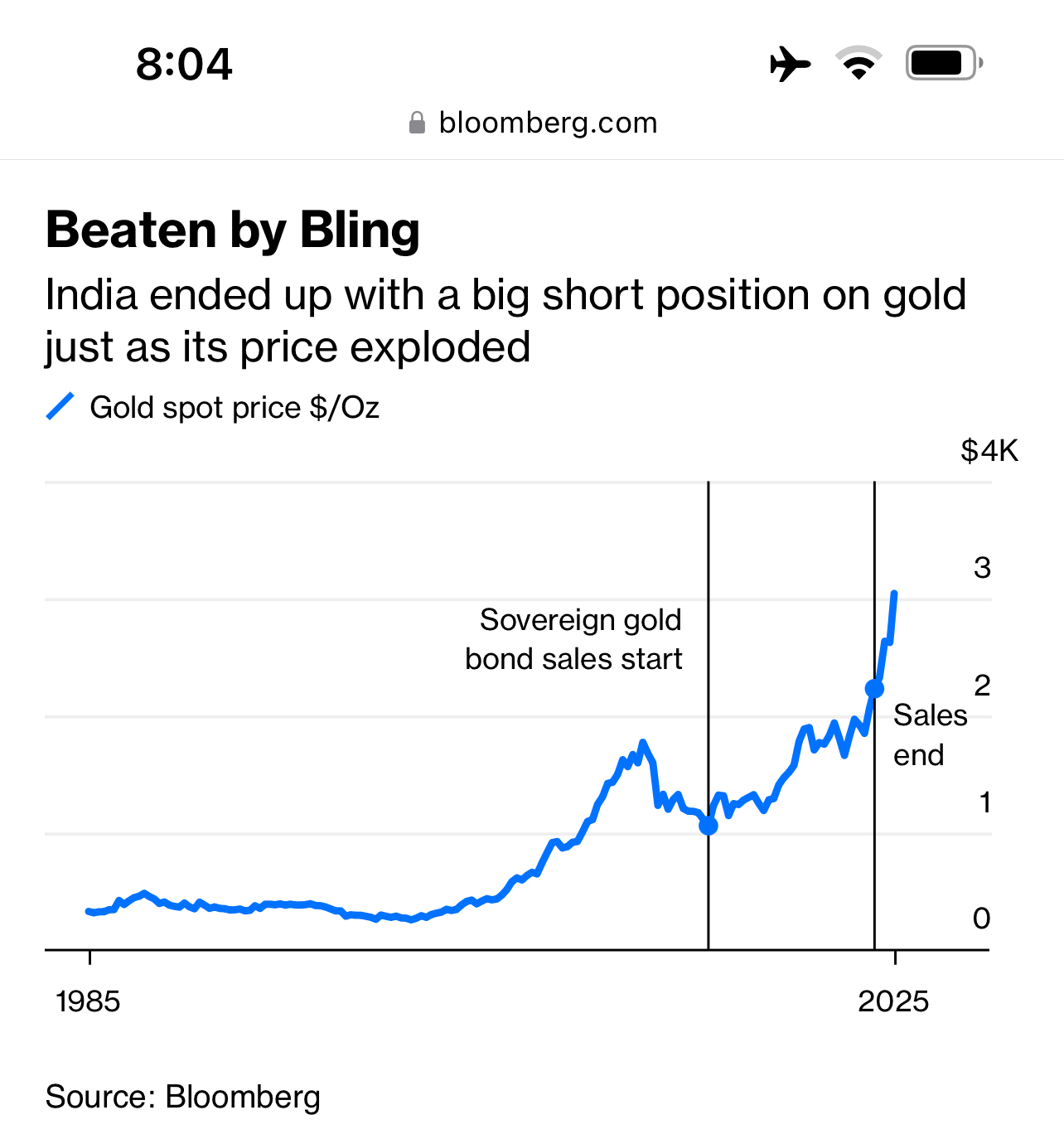 As it’s becoming painfully evident now, India’s 10-year-old sovereign gold bond program is just a $13 billion naked short position for the government, an albatross around its neck at a time when bullion prices have gone parabolic and show no sign of subsiding. It’s the taxpayers who are on the hook for paying that money to bondholders.