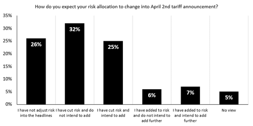 When Goldman asked its clients how they expect their risk allocation to change into April 2nd tariff announcement, the majority answered they have cut risk and do not intend to add (107 votes).