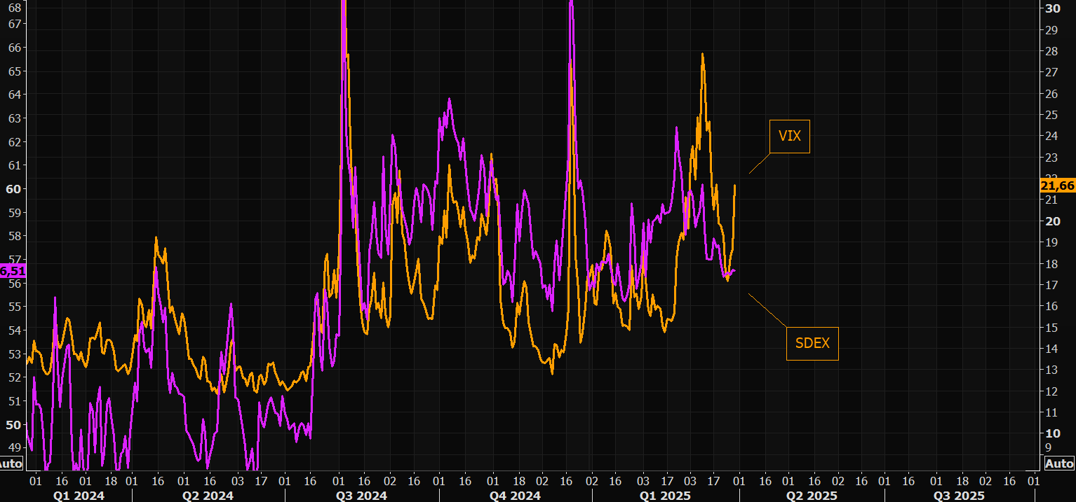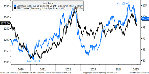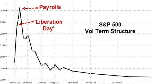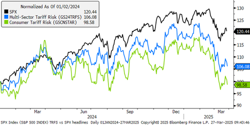 As we reported earlier this week (see " Goldman Warns Market Expectations For Trump's April 2 Reciprocal Tariffs Are Far Too Optimistic") Goldman’s house view on the April 2 reciprocal tariffs, aka "Liberation Day", is more bearish than market expectations, and one explanation for today's selling is that clients are taking off risk because listed products are not capturing the trade fear dynamics efficiently.