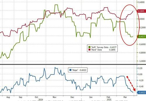The second chart to sum up Q1 is the growing divergence between strong hard data and weak soft data...