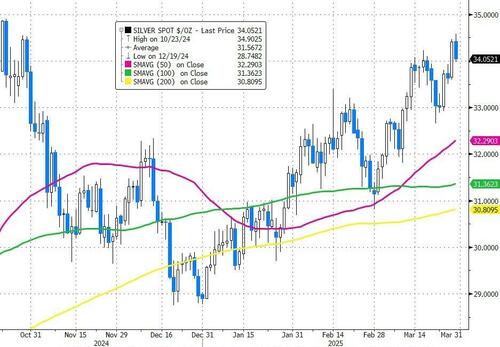 Silver prices soared in Q1, back above $34...