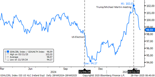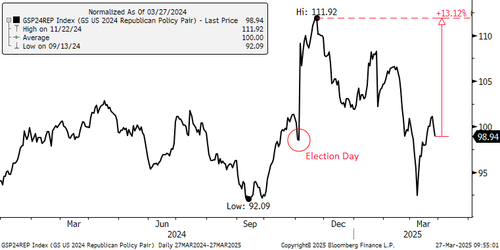 Republican policy outperformers vs underperformers (GS24REPL vs GS24REPS) is trading near election day levels, but are still ~10% away from election results highs. We started the year with high growth expectations, multiple rate cuts scheduled, and an overall positive outlook mainly driven by the new administration. But investors are not seeing this yet. Instead, the administration is focused first on tariffs, government spending cuts, and immigration reform while deregulation, tax cuts, AI and infrastructure spending are still in progress. Growth fears driven by recent economic data as well as current policy focus has unwound all gains since the election in the Goldman Republican Policy Outperformers vs Underperformers pair (GSP24REP). This is an opportunity to buy the dip considering the bank continues to have high conviction in the new administration’s de-regulation plans, AI and Infrastructure spending plans. It is a matter of when, and not a matter of if.