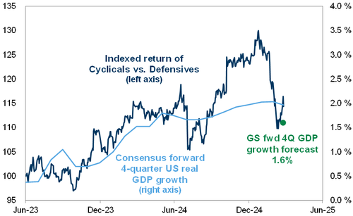 Cyclicals vs Defensives ex commodities have rebounded in the last couple of days and are not pricing in growth above GS forecasts for 2025 (Credit to Jenny Ma in GS equity strategy research for this chart)