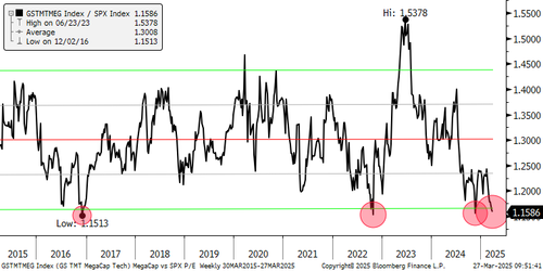 MegaCap tech, i.e., Mag 7 and the likes (GSTMTMEG) valuation premium over the market is reaching the lowest level in the last decade. Pretty much the entire Goldman trading desk likes going long Megacap tech at these levels.