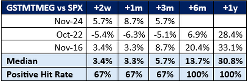Here is the performance of megacap tech performance relative to the S&P 500 following the trough on relative valuations: quite bullish for mega tech.