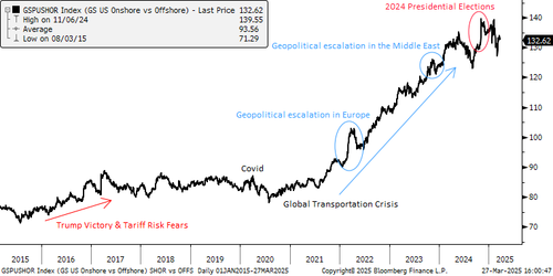 • Long companies that benefit from onshoring trends (GSXUSHOR) vs Short companies that would face challenges if they are unable to move operations to the US (GSXUOFFS)