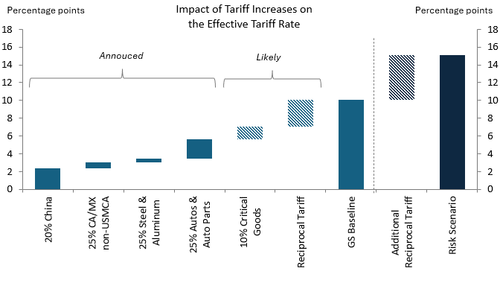Let's take a closer look at each of these, but first we start with a recap of what we wrote on Tuesday, namely the views of Goldman's political analyst, Alec Phillips, whose take on the looming tariffs was as follows: (1) officials anticipate negotiations with trade partners after April 2nd, (2) GIR’s recent survey shows investors expect a 9pp reciprocal tariff rate on average, and (3) we expect April 2nd tariff announcements to trigger a negative surprise effect on markets.