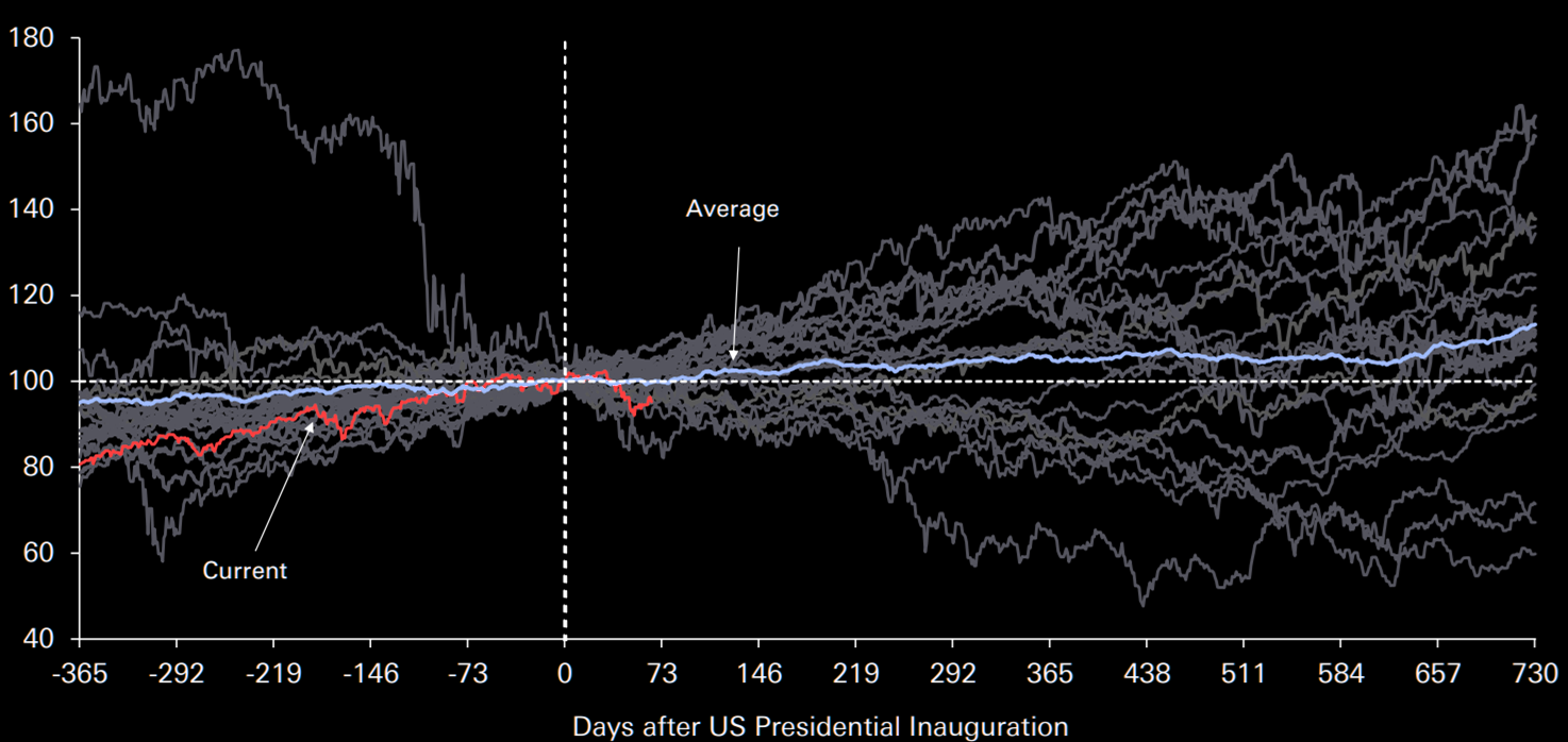 The chart shows that for all the post-inauguration periods since 1937 (when the current January 20th date was fixed), this year has been flirting with being the second-worst for the S&P out of 23 election cycles. 2001 is the worst, back when the stock market collapse accelerated following the dot com bubble.