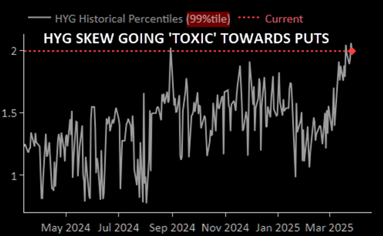 Q1 saw relentless hedging for wider spreads in High Yield ETFs on perception of economic slowdown “cycle turn” risks building - HYG Skew at 99%ile