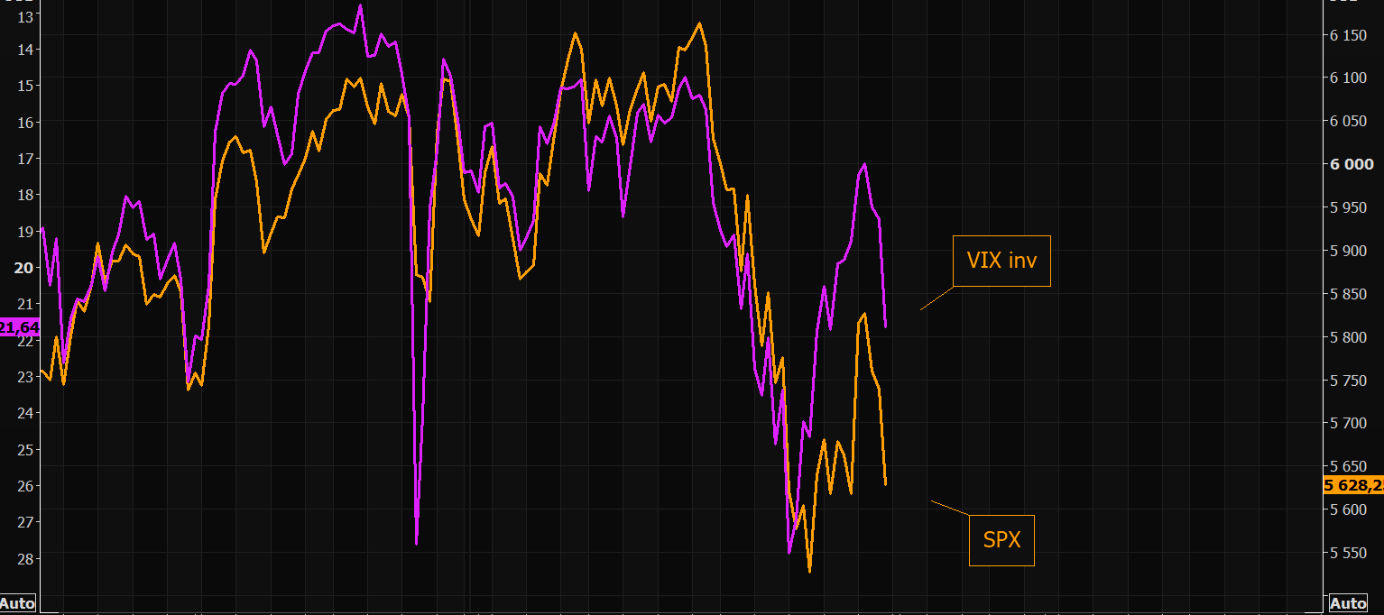 VIX moving sharply to the upside, but still far from recent "panic" levels. Chart shows SPX and VIX (inverted).