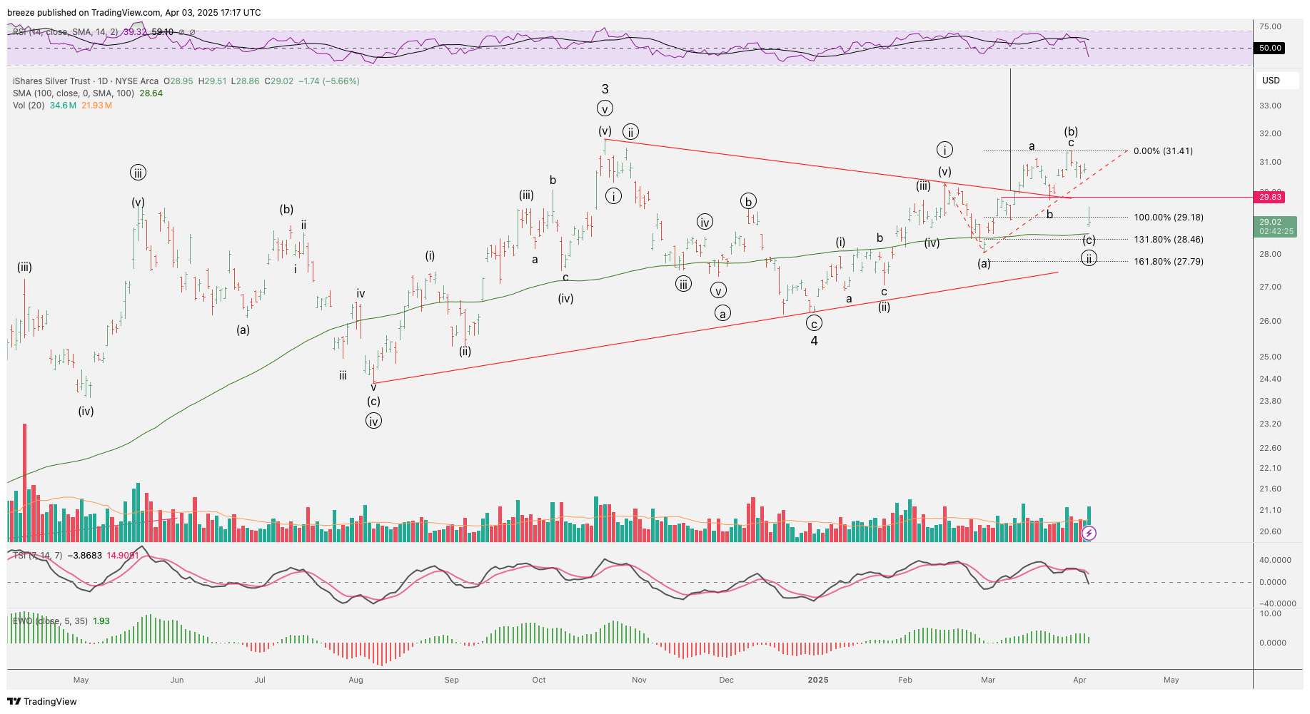 Moorso, here's a SLV Wave Count Update. Intermediate Wave (circle) ii has unfolded as an expanded ABC correction that typically ends when Wave (c) equals Wave (a)'s decline. In this case 27.79. If the 100 DMA doesn't hold then watch the 131.8% level. Breeze