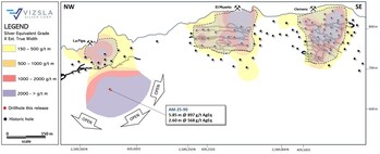 Figure 2: Longitudinal section for Animas structure with historic drillhole pierce points (black) and hole AM-25-90 (red) tapping high grade mineralization below historic mine workings at La Pipa. The gray polygons with black dash line represent estimated mined out high-grade mineralization done local miners on the upper 100 metres of the vein. (CNW Group/Vizsla Silver Corp.)