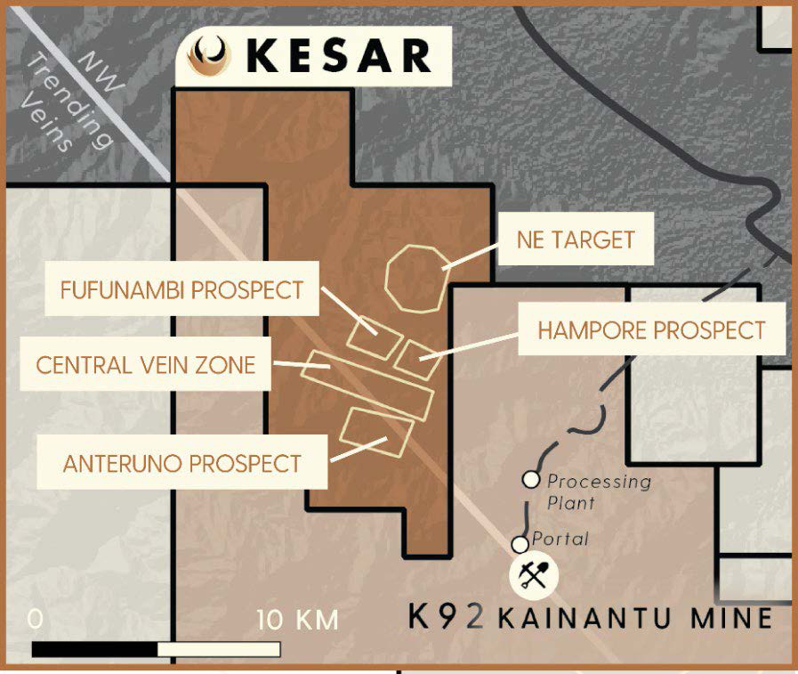 - Kesar – located in the Eastern Highlands province of PNG and contiguous with K92 Mining’s mine tenements, Kesar is a greenfield exploration project with several high priority targets in close proximity to the property boundary with K92. Multiple epithermal veins at Kesar are on strike and have the same orientation of key K92 deposits such as Kora. Exploration work to date by GPAC at Kesar has shown that these veins have high grades of gold present in outcrop and very elevated gold in soil grades, coincident with aeromagnetic highs.