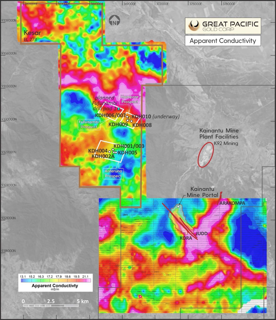 The apparent conductivity trends from the Kesar MobileMT survey are shown in Figure 2, alongside publicly available data from the nearby K92 Mine for regional comparison.