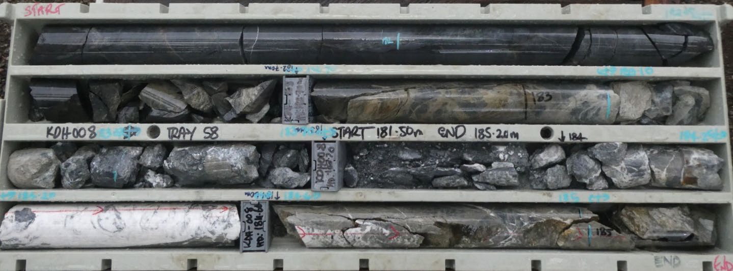 Figure 4: KDH-08 Core Photograph: 181.5 – 185.2m; Hydrothermal breccia with Quartz-Carbonate vein and semi-massive pyrite.