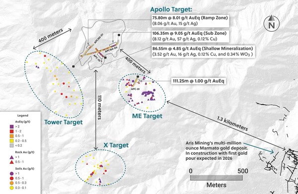 - One rig is being mobilized to the ME target, which locates midway between to the Apollo system and Aris Mining Corporation's Marmato mine to its southeast. Five shallow holes were drilled into the ME target in 2023 and discovered a precious metal rich breccia system with APC-81 intersecting 111.25 metres @ 1.00 g/t AuEq.1 A recent reinterpretation of the prior drill results highlights that potential exists for Ramp Zone style mineralization (Au-Ag-Bi-Te) to occur at a deeper elevation within the ME target. The Company expects drilling at the ME target to commence towards the end of April 2025 with first assay results expected in early Q3 2025.