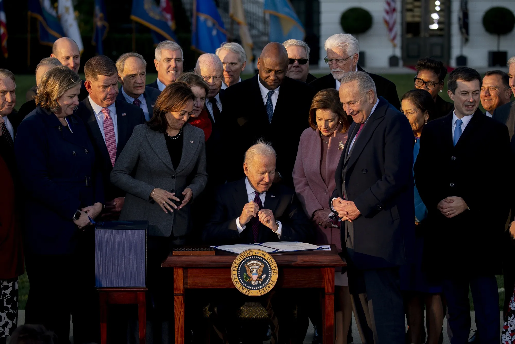 Joe Biden signs the Infrastructure Investment and Jobs Act in 2021. Photographer: Stefani Reynolds/Bloomberg