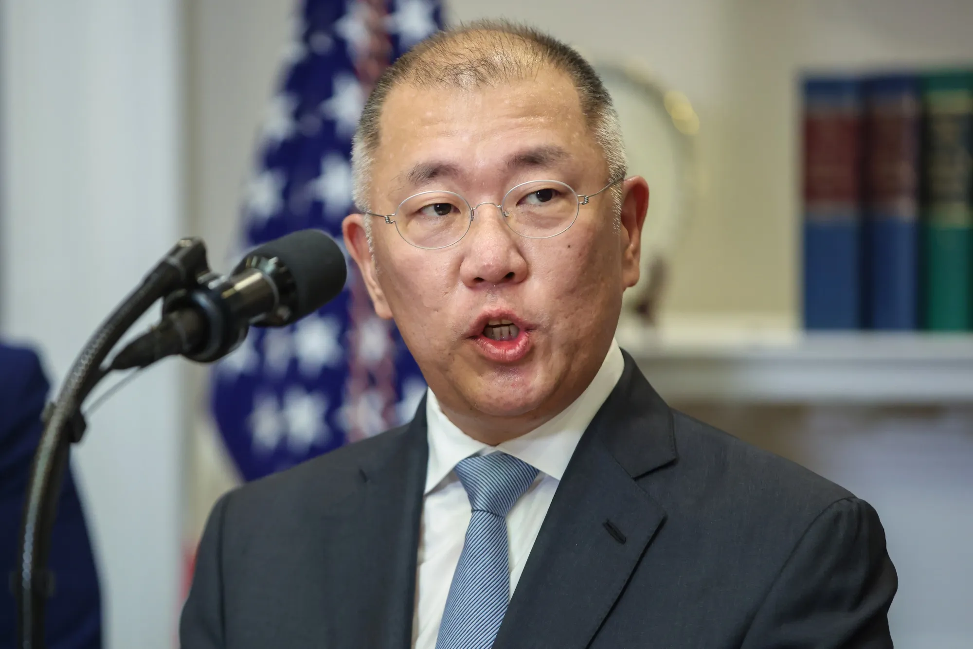 Chung Euisun, chairman of Hyundai Motor Co., announces a new steel plant in Louisiana while speaking at the White House. Photographer: Samuel Corum/Sipa/Bloomberg