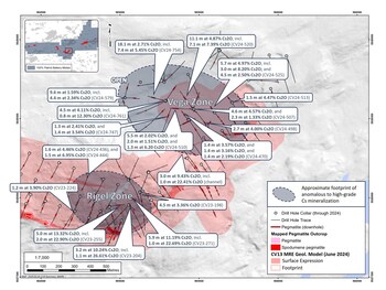 The newly named "Rigel Zone" is situated coincident with the apex of the structural flexure at CV13 and is estimated through drilling to have a high-grade footprint of approximately 200 m x 80 m at up to ~5 m thick. This zone includes the highest cesium grades reported to date from the Property – 1.1 m at 26.61% Cs2O (CV23-204) and 2.0 m at 22.90% Cs2O (CV23-255) – which imply intervals of near-massive pollucite and represent some of the highest known cesium grades reported globally in recent years.