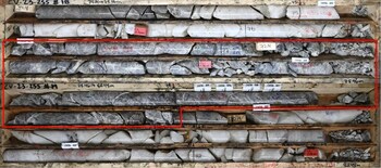 Figure 4: Semi-massive to massive pollucite intercept (red box) in drill hole CV23-255 (Rigel Zone) grading 17.95% Cs2O over 3.7 m (76.3 m to 80.0 m), including 22.90% Cs2O over 2.0 m (78.0 m to 80.0 m). (CNW Group/Patriot Battery Metals Inc.)