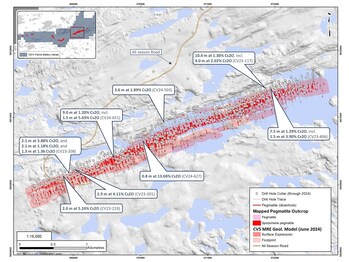 The initial discovery of two (2) distinct zones of cesium enrichment at CV13 was first announced in the Company's news release dated March 2, 2025, and was based on drill hole pegmatite intercepts which had returned analytical results for cesium that exceeded the detection limit – >10,000 ppm Cs (i.e., >1% Cs or >1.06% Cs2O) – of the analytical package. With the overlimit analytical results now received, the final grade-width calculations for the intervals >1% Cs2O are reported in this news release (see Figure 1, Figure 2, Figure 3, Figure 4, Table 1, and Table 3).