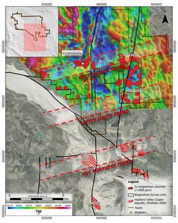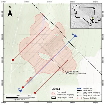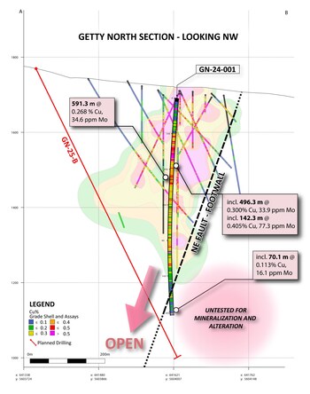 Drillhole GN-24-001 was successful in extending Cu and Mo mineralization 125 m below known mineralization and may represent a new zone. Drilling was planned to provide valuable multi-element data for the deposit, and to test the deposit at depth. The hole intersected 496.3 m of 0.300% Cu and 33.9 ppm Mo prior to intersecting the Northeast Bounding fault at a depth of 523 m. A new mineralized zone was intersected in the footwall of the Northeast Bounding fault, which had previously been believed to limit the Getty North deposit to the east and northeast. Mineralization and porphyry alteration were observed in the footwall of the fault indicating the potential that the faulted off portion of the Getty North Deposit or another Cu mineralized porphyry could exist in the footwall of the Northeast Bounding fault. The grades below the fault are reduced by related low angle faulting in the interval, and Getty Copper is planning a follow-up drill program to test potential down plunge extensions and footwall mineralization below the Getty North Deposit.Untested Regional Targets Porphyry deposits in the Highland Valley are clustered around fault intersections between east trending and north trending structures. The Getty Land Package covers extensions of the major north trending Lornex and Bethlehem faults directly associated with Teck's Highland Valley Copper deposits and contains several significant untested targets. Likely cross-structures matching this pattern have been identified from linears visible in the 2022 MobileMT and 2017 Airborne surveys completed by Getty Copper. These features coincide with significant copper biogeochemical anomalies that were completed between 2019 - 2023. Quality Assurance and Quality Control Hole GN-24-001 was drilled at an NQ diameter and transported to a secure logging facility in Logan Lake. Geologists and Technicians processed the core, checked depth markers, and completed geological and basic geotechnical logging on the core. Samples were selected by geologists to be approximately 2 m, respecting geological breaks. Core was cut in half and bagged on site. Blanks, duplicates, and certified reference standards are inserted into the sample stream to monitor laboratory performance. Cut core was taken directly to the ALS sample preparatory lab in Kamloops. here they were weighed, dried, crushed, and pulped according to ALS's PREP-31 protocol. ALS is an accredited laboratory independent of Getty Copper. From Kamloops samples were sent to ALS in Vancouver. Samples were assayed by multi-element ICP (ME-MS41) and gold by a 30 g fire assay (Au-AA23). No data quality issues were indicated by the QA/QC program.Qualified Person: Alicia Carpenter, P. Geo., an independent consulting geologist who is a "Qualified Person" as defined by National Instrument 43-101, has approved the technical content of this news release.About Getty Copper Inc. Getty Copper is a Canadian mineral exploration and development company committed to increasing shareholder value through exploration, discovery and development of new base metal or gold deposits. Getty Copper's Highland Valley Project is located outside Logan Lake, BC, within a 269 sq km. land package situated directly north of Teck's Highland Valley Copper Mine. The area has extensive support infrastructure including highway and railhead access, power, water, a stable skilled labour force and a climate which permits year-round mining. ON BEHALF OF THE BOARD OF DIRECTORS SOURCE Getty Copper Inc. Thomas MacNeill, CEO, Director, GETTY COPPER INC., Phone: 604-931-3231 Fax: 604-931-2814