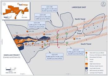 Figure 1– Location of winter 2025 drill holes with respect to the Deposit resource footprint (blue) and the ANT seismic low velocity zone in which the Deposit occurs, and projected Hurricane mineralization-controlling fault zones. RS-125 values are highest averages over 0.5 m intervals. (CNW Group/IsoEnergy Ltd.) Figure 2 – Location of 2025 target areas and winter drill holes along the Larocque Trend, including drill holes in Target Area D, located 2.8 km east of the Deposit. In addition to targets near the Deposit, greenfield potential will be tested this summer in areas D, E and F along a six-kilometre segment of the Larocque Trend. RS-125 values are highest averages over 0.5 m intervals. (CNW Group/IsoEnergy Ltd.) Table 1: Drill hole summary and RS-125 spectrometer results for holes with >350 cps. (CNW Group/IsoEnergy Ltd.) Figure 3 – Joint resistivity – electromagnetic inversion model of the Larocque East project completed by Convolutions Geoscience and Computational Geosciences that highlights an untested 2,500m northern conductivity trend. (CNW Group/IsoEnergy Ltd.) Figure 4 – Main Trend: Cross section through LE25-194 and LE25-203 on the East Trend looking east. (CNW Group/IsoEnergy Ltd.) Figure 5 – South Trend: Core photo of drill hole LE25-207 from 310 m to 333.5 m showing interval from 323.0 m to 329.0 m with elevated radioactivity up to 8800 cps averaged over 50 cm on the RS-125 spectrometer. The unconformity is at 323.8 m. (CNW Group/IsoEnergy Ltd.) Figure 6 – Cross section through LE25-202, 204 and 206 on the west end of Target Area ‘D’ looking east. (CNW Group/IsoEnergy Ltd.) Table 2: Drill hole summary and RS-125 spectometer and 2PGA downhole probe results for winter 20-2025 drill holes on the Larocque East project. (CNW Group/IsoEnergy Ltd.)