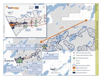 IsoEnergy Intersects Strongly Elevated Radioactivity in Multiple Holes Immediately Along Strike of Hurricane and In Step-Out Target Area D, 2.8 km East newswire.ca News provided by IsoEnergy Ltd. Apr 23, 2025, 07:00 ET TORONTO, April 23, 2025 /CNW/ - IsoEnergy Ltd. ("IsoEnergy" or the "Company") (TSX: ISO) (OTCQX: ISENF) is pleased to announce the completion of its winter drilling program at the Larocque East Project (the "Project"), located in the eastern Athabasca Basin. The Company successfully completed 17 diamond drill holes, totaling 6,396 m, along the Larocque Trend ("Larocque Trend"), an important regional structure that hosts the Hurricane Deposit ("Hurricane" or the "Deposit") containing a current Indicated Mineral Resource of 48.6 Mlbs at 34.5% U3O8 and an Inferred Mineral Resource of 2.7 Mlbs at 2.2% U3O8 (See "Qualified Person Statement" below). The Larocque Trend also hosts other notable high-grade occurrences including those on Cameco and Orano's Dawn Lake joint venture. The Company's drilling intersected strongly elevated radioactivity, in five holes, along the eastern extensions of the Hurricane Deposit main and south trends, as well as at Area D, 2.8 km east of Hurricane, highlighting the potential for additional zones of uranium mineralization both immediately on strike of Hurricane and regionally along the 9 km of the Larocque Trend on the Project.