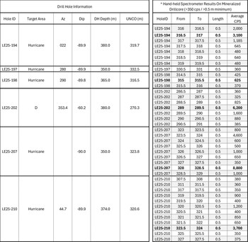 - Hole LE25-202 returned an average RS-125 reading on over 0.5 m on core of 6,200 cps and up to 28,782 cps downhole probe within that interval in Area D, a standalone zone located 2.8 km east of Hurricane (Figure 2).