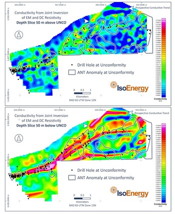 IsoEnergy engaged Convolutions Geoscience and Computational Geosciences Inc. to complete a 3D joint inversion of ground loop time domain electromagnetic (GTEM) and DC resistivity data collected during historic surveys on the Project.