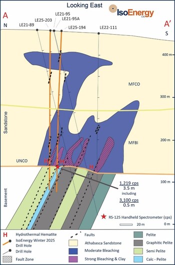 Hole LE25-198 drilled 100 m east of hole LE25-194, intersected widespread bleaching throughout the sandstone. Clay and limonite alteration, centered on a fault, were intersected from 259 to 263 m. A broad structural zone with continuous strong bleaching, desilicification, and clay alteration is present below 287 m. Fault-controlled hydrothermal hematite and weak grey alteration were intersected approximately 10 m above the unconformity, indicating the hole overshot the ideal target. Strong pervasive limonite and clay alteration continued to the unconformity at 316.5 m. The basement rock immediately below the unconformity is moderately argillitized and chloritized, with above-background radioactivity as measured on core and by downhole gamma probing extending from 314.0 m in sandstone down to 321.1 m in basement. Peak values recorded on drill core with the RS-125 spectrometer and with the 2PGA downhole probe are 625 cps average over a 0.5 m interval and 26,503 cps respectively. Hole LE25-198 is interpreted to have overshot the target, and potential for mineralization remains high to the north.