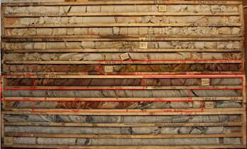 Composite geochemistry samples consist of roughly one-centimetre-long chips of core collected every 1.5 m to geochemically characterize unmineralized sections of sandstone and basement. Composite sample lengths are between five and ten m (typically 3 to 7 chips per sample). A change to this procedure was made in 2024. For 5 m above and 2 m below the unconformity composite sample intervals are 0.5 m long.