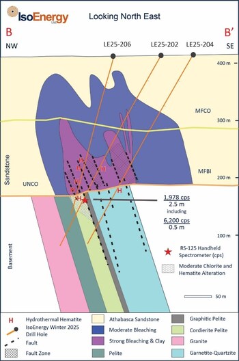 Hole LE25-202, the first drill hole on section (Figure 6), intersected weak to moderate bleaching in the upper sandstone. In the lower sandstone, below 206 m, alteration is moderate to strong with a broad bleached, clay and desilicified zone centred on faults. Moderate to strong limonite in present over a 10 m interval below 254 m. The hole intersected unconformity at 270.3 m and hematitic breccia immediately below unconformity. A second hematitic fault was intersected at 282 m before the drill hole intersected a moderately hematitic radioactive zone from 286.5 to 291.0 m. Blebs and fracture-hosted uranium mineralization are associated with the highest RS-125 reading of 6200 cps over 0.5 m.