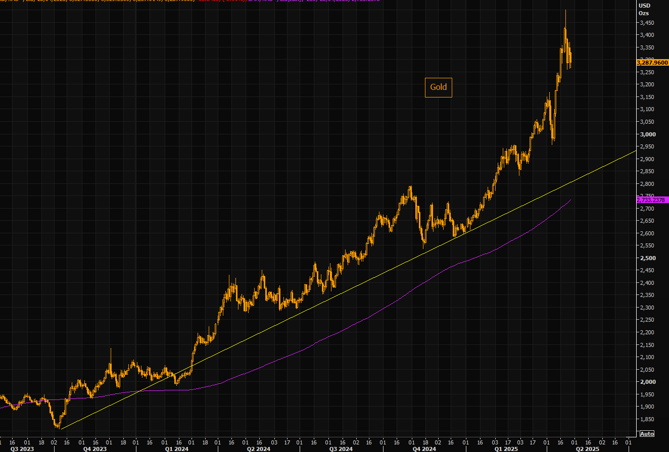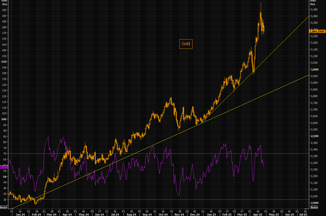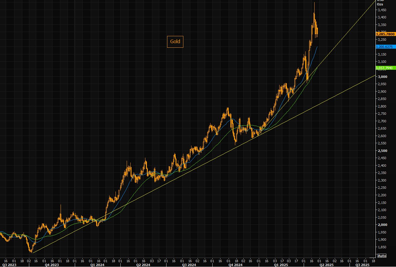 Gold is down some $215 from the ATH print we saw a few sessions ago. So far this is just a much needed pullback. Supports to watch: $3200, this is where the 21 day comes in. After that comes the short term trend line and the 50 day, currently another $200ish lower. Resistance around the $3450 area.