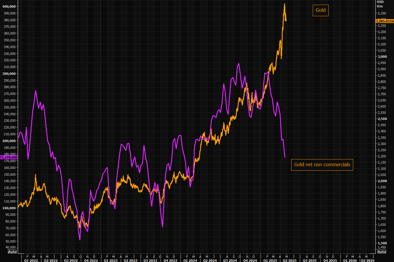 Latest update shows gold net non commercials at the lowest levels in more than a year. Treat this as a massive "implied" bid, or a big warning sign?