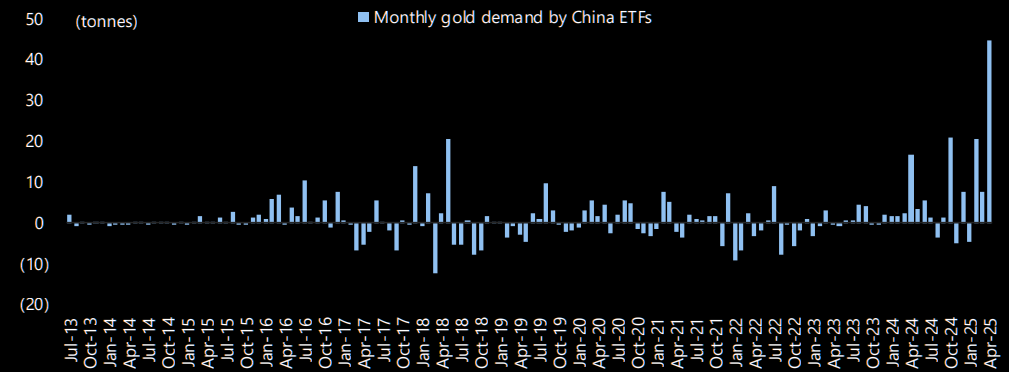 Monthly gold demand by China gold ETFs exploding to the upside.