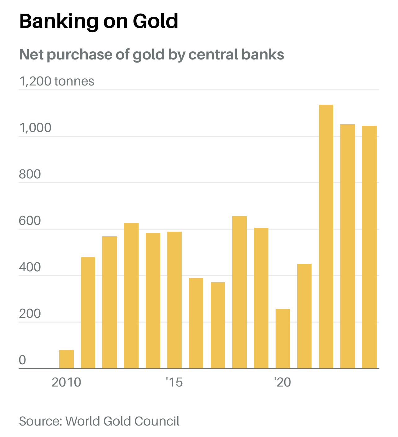 That year, the U.S. and dozens of allies placed sweeping sanctions on Russia, including its largest banks, and China went on a bullion spree. Its buying has since cooled, but other central banks have stepped in. Perhaps this is unsurprising, in light of a decadeslong diversification by finance ministers away from the U.S. dollar, which is down to 57% of foreign reserves from over 70% in 2000. But the recent uptick in gold stockpiling looks to JPMorgan Chase, the world’s largest bullion dealer, like a debasement trade. Investors are nervous about President Donald Trump’s tariffs, his browbeating of the Federal Reserve Chairman over interest rates, and blowout U.S. deficits.