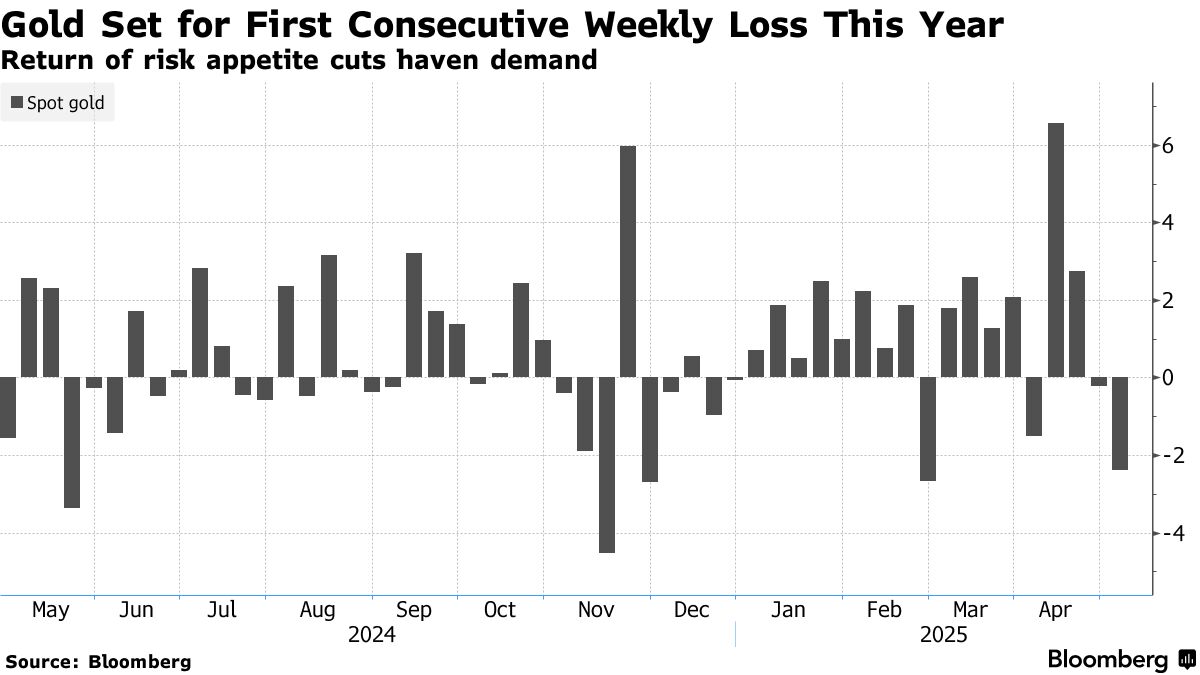 To: bull_dozer who wrote (214074 ) 5/1/2025 9:38:24 PM From: TobagoJack Respond to of 218039 >> THE F*CKING F*CKS … now, per below, we know ‘they’ are sooooo lying, for we were told by DeepSeek that June rate might be in range of 0.75%bloomberg.com Gold Heads for Weekly Loss as Traders Pare Back US Rate Cut Bets By Sybilla Gross 2 May 2025 at 08:25 GMT+8Gold is set for its first back-to-back weekly loss this year, with losses this week at more than 2%. Summary by Bloomberg AI The precious metal's haven appeal faded as earnings drove optimism in markets alongside potential trade-talk progress between the US and other nations. Summary by Bloomberg AI Despite this week's sharp selloff, gold is up about a quarter this year and hit a record above $3,500 last week. Summary by Bloomberg AIGold was set for its first back-to-back weekly loss this year, as risk appetite returned to Wall Street on strong tech earnings and traders curbed their bets on US interest-rate cuts this year after factory activity data. Bullion traded little changed near $3,240 an ounce — putting losses this week at more than 2% — after a report showed manufacturing activity shrank in April at a pace that slightly surprised to the upside. Markets pared wagerson the size of the Federal Reserve’s easing trajectory this year, with the first quarter-point rate reduction fully priced in for July. Both higher rates and yields tend to weigh on non-interest bearing gold. Elsewhere, the precious metal’s haven appeal faded as earnings largely drove optimism in markets alongside potential trade-talk progress between the US and other nations. Still, Thursday’s financial results from tech behemoths Apple Inc. and Amazon.com Inc. underscored worries about the outlook, with both companies expecting a tougher business climate in coming months amid escalating tariff costs. Investors continue to weigh the impacts of US President Donald Trump’s fast-evolving tariff agenda, which has roiled global markets. Vice President JD Vance said a trade deal with India will be “among” the first agreements, and added that negotiations were also underway with Japan, South Korea and “folks in Europe.” Despite this week’s sharp selloff, gold is up about than a quarter this year and hit a record above $3,500 last week before losing some ground amid signs the rally was overheated. The ascent has been driven by investors taking refuge in the haven asset on mounting fears that unconventional policies from the White House could stoke a global slowdown. Read More: Gold-Backed ETFs Stage a Comeback in 2025 on Trade War Fears Speculative demand in China and central-bank buying has also supported gains. Traders will on Friday also weigh a US jobs report , the last piece of significant data this week. Spot gold was little changed at $3,242.97 an ounce as of 8:23 a.m. in Singapore, and is down 2.3% this week. The Bloomberg Dollar Spot Index was flat, after a 0.5% gain in the previous session. Platinum was little changed while silver and palladium edged higher.