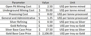 Metal prices used for this resource estimate are US $27.50 per ounce of silver and US $2,106 per ounce of gold. These prices are used for the exploitation scenarios related to reasonable prospects for eventual economic extraction. The 3-year trailing average metal prices are US $2,146 per ounce of gold and US $25.11 per ounce of silver. Spot prices for April 30, 2025 were US 3,328 per ounce of gold and US $33.19 per ounce of silver.