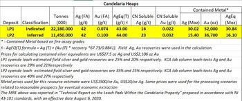 | Table 2. Candelaria Leach Pad mineral resources. As reported on August 18, 2020 company's news release.