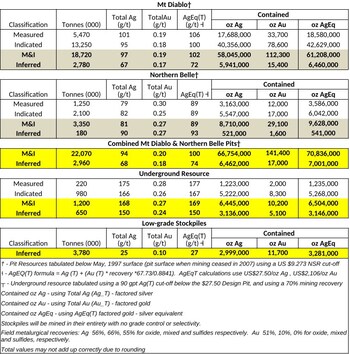 Totals above include pit Constrained Mineral Resources (Mt. Diablo and Northern Belle) at a US$9.273 NSR cut-off, within a US$27.50/oz Ag optimized pit shell (see footnotes and Resource Estimate Details section below).