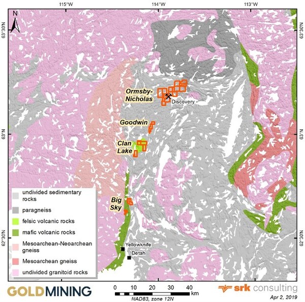 Located  along approximately 100 kilometers of the Yellowknife Greenstone Belt,  the Yellowknife Gold Project is comprised of five individual properties:  Ormsby – Bruce, Nicholas Lake, Goodwin Lake,  Clan Lake and Big Sky (see Figure 1). The Ormsby property hosts the  Discovery Mine which operated from 1950 to 1969 with total production  estimated to be 1,023,550 oz of gold from 1,018,800 short tons (st) of  ore. The average production grade of slightly more than one oz of gold  per st is generally considered the highest average grade of produced  gold in the Yellowknife gold district, and one of the highest grade gold mines in Canada  with production over one million ounces of gold. References to past  production activity at the Discovery Gold Mine is provided for  information purposes and is not intended to be indicative of future  exploration at the Project.