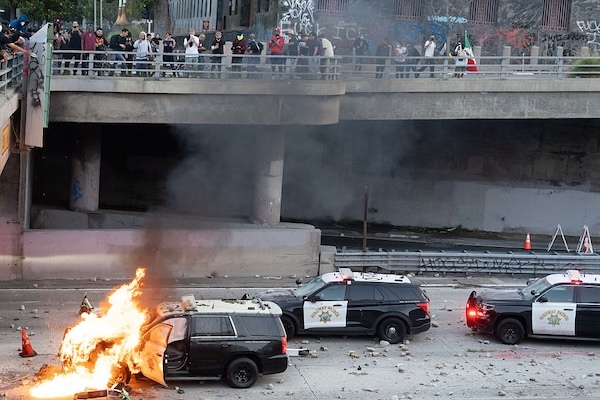Respond to of 74613 Vandalized police cars in Los Angeles, Calif., on June 8, 2025. (Ali Matin/Middle East Images via AFP)
