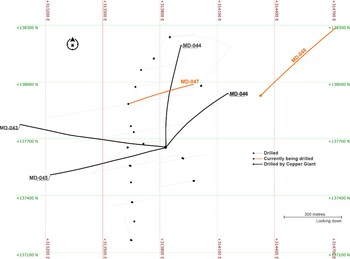 Figure 1. Plan view of hole MD-048 and MD-048. *Coordinates are UTM system, zone 18N and WGS84 projection. (CNW Group/COPPER GIANT RESOURCES CORP.) Figure 2. Plan view of MD-048 showing the Molybdenum soil anomaly and selected rock samples. Cross-section shown in figure 3 is highlighted in grey. *Rock and soil sampling results are inherently selective in nature. As such, these results may not be representative of the underlying geological values or the overall mineralization within the sampled area. (CNW Group/COPPER GIANT RESOURCES CORP.) Figure 3. Cross-section along the hole MD-048 with a projection influence of 200m. *Copper equivalent (CuEq) for drill hole interceptions is calculated as: CuEq (%) = Cu (%) + 4.2 × Mo (%), utilizing metal prices of Cu - US$4.00/lb and Mo - US$20.00/lb and metal recoveries of 90% Cu and 75% Mo. Rock and soil sampling results are inherently selective in nature. As such, these results may not be representative of the underlying geological values or the overall mineralization within the sampled area. (CNW Group/COPPER GIANT RESOURCES CORP.)