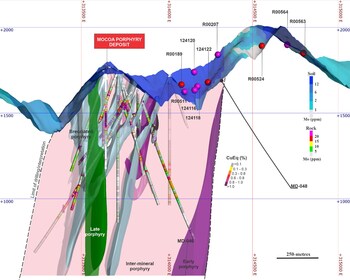 *Copper equivalent (CuEq) for drill hole interceptions is calculated as: CuEq (%) = Cu (%) + 4.2 × Mo (%), utilizing metal prices of Cu - US$4.00/lb, Mo - US$20.00/lb. Metal recoveries utilized for the resource model are 90% for Cu and 75% for Mo.