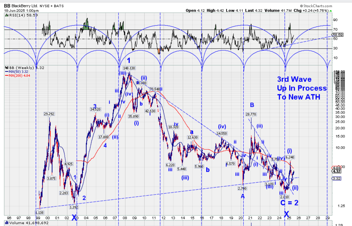 BB looks in the ST to have completed a (i) of 1 of 3 up, looks like this next move should yield 10 plus. In the longterm I think we can expect a pretty major correction of sorts in the general markets about end of '26, early '27. Not overly optimistic to think that BB will have exceeded the previous B top by then. Midtine area?