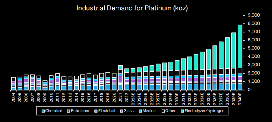 Below is a breakdown of industrial demand for platinum. Demand for platinum hinges on the hydrogen economy.